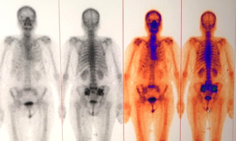 Một bệnh nhân 78 tuổi khác bị ung thư cổ tử cung được xạ trị. Xạ hình xương tại Bệnh viện Bãi Cháy phát hiện di căn vùng chậu, sau đó bệnh nhân được xạ trị vùng chậu và điều trị chống tiêu xương. Ung thư xương nằm trong 60 ca ung thư đầu cổ, ung thư phổi, ung thư cổ tử cung… đây là công nghệ chủ đạo của y học hạt nhân hiện đại. Thế giới .—— Ảnh chụp xương của bệnh nhân ung thư trong bệnh viện. Ảnh: Mạc Thảo