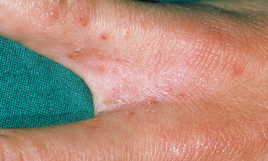 Xuất hiện các vết loét quanh ngón tay, bàn tay và rốn. Ảnh: WebMD-Một số bệnh khác, chẳng hạn như viêm kẽ do vi khuẩn, thường gặp ở những người béo phì và xuất hiện ở các nếp gấp ở bẹn, nách, cổ và vú của phụ nữ. Nguyên nhân là do vệ sinh kém và mồ hôi bị ứ đọng, tạo điều kiện cho vi khuẩn phát triển. Hoặc bệnh do vệ sinh kém, thiếu chất dinh dưỡng dễ làm tổn thương da, nổi mụn mủ, tập trung nhiều ở vùng hở, tay, chân. Bệnh cần điều trị sớm để tránh những biến chứng nguy hiểm như viêm cầu thận.