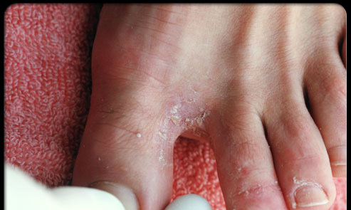 Một số loại nấm gây viêm kẽ cũng bao gồm mụn nước hoặc vết loét, đôi khi bị nhầm với bệnh chàm hoặc da khô. Nhiễm trùng có thể ảnh hưởng đến một hoặc cả hai bàn chân, sau đó lan sang bàn tay, đặc biệt là do gãi vào phần bàn chân bị nhiễm trùng.