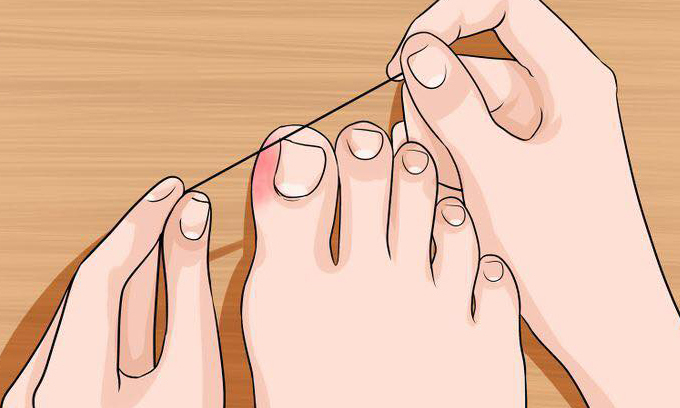 Lau khô bàn chân và xỏ chỉ bằng góc móng tay vào da. Chân, xuyên qua da với góc của móng tay.