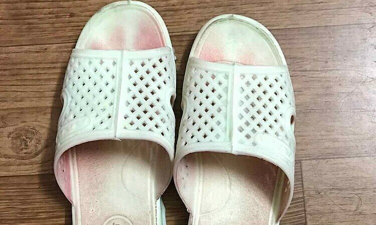 Đôi dép của bệnh nhân. Ảnh: do bác sĩ cung cấp-mồ hôi (hyperhidrosis hay mồ hôi) rất hiếm. Biểu hiện lâm sàng của hiện tượng này là mồ hôi do mồ hôi tiết ra có lẫn máu. Màu sắc của mồ hôi có thể khác nhau, tùy thuộc vào lượng máu: đỏ tươi, hồng hoặc hồng nhạt.