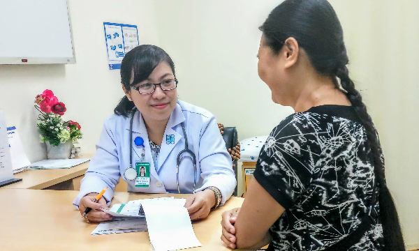 Bác sĩ khám cho bệnh nhân tiểu đường tại Bệnh viện Cao đẳng Y Dược TPHCM. Ảnh: N.P