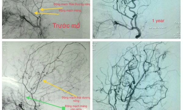 – Khảo sát hình ảnh bệnh nhân mắc Moyamoya trước và sau phẫu thuật. Phụ nữ có khả năng mắc bệnh này cao gấp đôi. Độ tuổi phổ biến cho trẻ em là 5 đến 9 tuổi. Hầu hết bệnh nhân nhi được đưa vào bệnh viện vì nhồi máu não hoặc cơn thiếu máu não thoáng qua. Ở trẻ em, bệnh thường bắt đầu sau khi gắng sức. Ở trẻ nhỏ, ăn uống, lo lắng hoặc ho cũng có thể gây thiếu máu não hoặc đột quỵ. Các triệu chứng khác bao gồm đau đầu, chóng mặt và co giật … Do bệnh phát triển nhanh, nhu cầu cung cấp máu của não ngày càng không đủ. Nếu không được điều trị kịp thời, nhiều cơn đột quỵ có thể xảy ra. Với mỗi cơn đột quỵ, não sẽ bị tổn thương không thể phục hồi, dẫn đến khiếm khuyết, di chứng thần kinh và thậm chí tử vong. Đứa trẻ được đánh giá, các mạch máu trong não được kiểm tra, và sau đó phẫu thuật được thực hiện để cung cấp một nguồn cung cấp máu mới cho não. Theo dõi cho thấy sau khi phẫu thuật, nhiều trẻ em không còn bị thiếu máu cục bộ và kiểm tra lại hệ thống mạch máu não để thấy một kết nối tốt từ bên ngoài đến não và cung cấp máu cho não. Trong một số trường hợp, do điều trị muộn, thiệt hại do đột quỵ trước đó nghiêm trọng đến mức vẫn sẽ có hậu quả về thần kinh sau phẫu thuật.