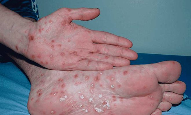 Từ tuần thứ 6 đến tuần thứ 8, cơ thể sẽ xuất hiện những đốm nhỏ màu đỏ thưa thớt, với các hình dạng khác nhau, như sẩn đỏ đỏ, thâm nhiễm và có thể có vảy tròn hoặc vẩy nến sẩn, mụn trứng cá, hoại thư, Sẩn phì đại, hầu như không ngứa. Triệu chứng này có thể kéo dài 2-3 năm. Hơn 3 tuổi, xoắn khuẩn đã xâm lấn và định cư trong các cơ quan nội tạng. Tại thời điểm này, bệnh nhân có biểu hiện là “giang mai” (da, cơ, xương), tổn thương tim mạch (giang mai tim mạch) và tổn thương thần kinh gây tê liệt (bệnh thần kinh). -Những triệu chứng của bệnh giang mai rất đa dạng và tiến triển trong từng thời kỳ khác nhau. Từ tuần thứ 6 đến tuần thứ 8, cơ thể xuất hiện những đốm chấm với hoa hồng đỏ. Ảnh: El Sol De Hermosillo