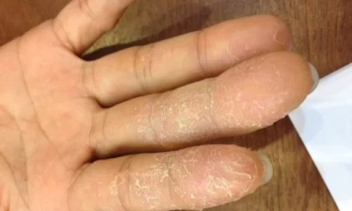 Các triệu chứng xuất hiện ở lòng bàn tay, bàn chân và ngón tay, da đỏ ở ngón chân, da khô và nứt nẻ, bong tróc không hoàn chỉnh và bong tróc sẽ gây rách và rách da và chảy máu. Những nơi phổ biến là bàn tay và ngón tay, đặc biệt là ở 1/3 đầu tiên của bàn tay và bàn chân.