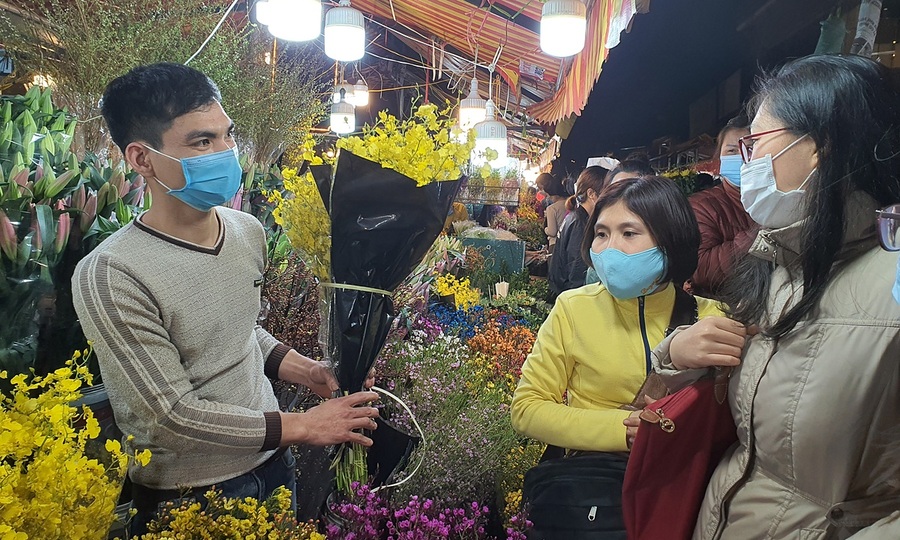 Lê cho biết: “Điểm khác biệt duy nhất so với năm ngoái là mọi người đều bịt khẩu trang, còn lại chợ hoa vẫn đông như chưa có Covid-19.” Đối với người Hà Nội, chợ Quảng Bá (Hà Nội Dahe) không chỉ để cung cấp hoa cho thủ đô. Hub, và là điểm đến văn hóa tiêu biểu cho mỗi dịp lễ hội mùa xuân. Quảng Bá nở tối 29 Tết. Ảnh: Đức Minh.