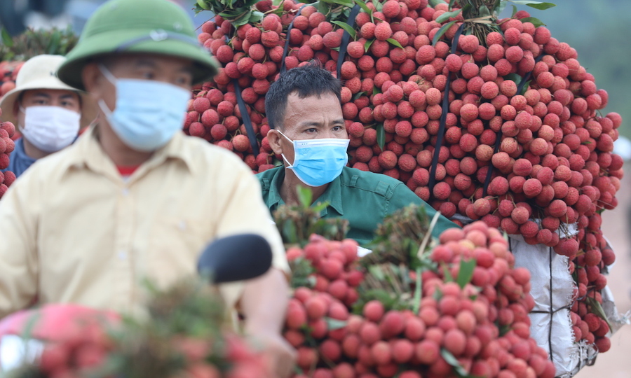 . Từ đầu tháng 6, các sản phẩm nông nghiệp của Bắc Giang này đạt 1.500 tấn trong 6 tòa tháp thương mại điện tử. Các hệ thống bán buôn và bán lẻ còn lại là khoảng 27.370 tấn. Nông dân ở Lục Ngân đang mang vải của trang web tiêu thụ. Ảnh: Ngọc Thành