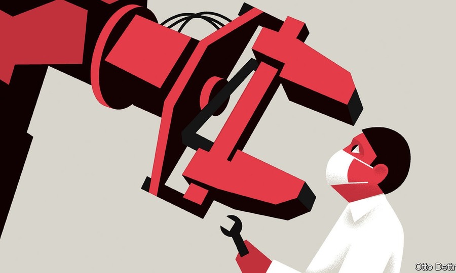 Ngoài ra, tự động hóa chỉ là một lựa chọn. Công nghệ giúp các công ty vượt qua cuộc khủng hoảng này. Làm việc từ xa ngày càng phổ biến hơn. Theo một ước tính, khoảng một nửa số người Mỹ đã làm việc trước khi dịch bệnh bùng phát bắt đầu làm việc từ xa vào tháng Năm. Ở một số công ty, việc chuyển hướng thậm chí là vĩnh viễn. Bằng cách giảm chi phí tổng thể và cho phép mọi người di cư đến các thành phố rẻ hơn, làm việc từ xa có thể tiết kiệm công việc và giảm áp lực chi phí cho các doanh nghiệp đang gặp khó khăn. — Việc phát triển và triển khai các công nghệ mới thường tốn kém. Ý định tự động hóa có thể kiểm tra nhu cầu trong bối cảnh người thất nghiệp đông đúc và sẵn sàng làm việc với mức lương thấp. Ví dụ, các lò giết mổ ở Hoa Kỳ thường thuê nhân công của một số lượng lớn lao động giá rẻ, nhiều người trong số họ là người nhập cư bất hợp pháp, và họ hiện ít tự động hơn ở các khu dân cư. Bắc Âu, khả năng thất nghiệp kỹ thuật quy mô lớn là khó xảy ra. Tuy nhiên, nếu chi phí lao động bắt đầu tăng thông qua chuỗi cung ứng toàn cầu, Covid-19 có thể bước vào kỷ nguyên của robot.Bạn đã bị phá vỡ, hoặc mức lương tối thiểu đã tăng. Hoạt động sản xuất ra nước ngoài có thể dẫn đến áp lực thay thế lao động nước ngoài giá rẻ bằng robot trong nước.