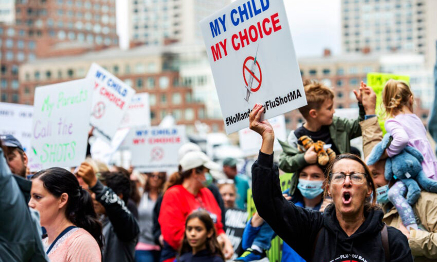 Những người biểu tình giương cao khẩu hiệu “My Choice Con le mien” để phản đối việc tiêm phòng cúm bắt buộc ở Boston, Mỹ ngày 5 tháng 10. Ảnh: AFP