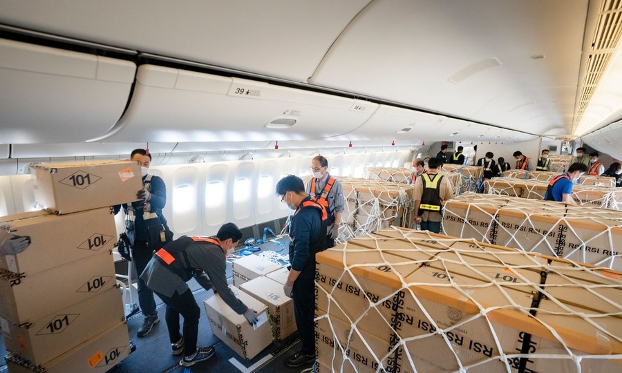 Hàng hóa trên khoang cất cánh từ ghế ngồi của máy bay Korean Air. Theo Hiệp hội Vận tải Hàng không Quốc tế, doanh thu hàng hóa toàn cầu dự kiến đạt khoảng 111 tỷ USD trong năm nay. Con số này chỉ cao hơn một chút so với dự báo đại dịch. Tuy nhiên, Hiệp hội Vận tải Hàng không Quốc tế đã hạ dự báo doanh thu hành khách cho năm 2020 từ 581 tỷ đô la Mỹ ban đầu xuống còn 241 tỷ đô la Mỹ. Điều này có nghĩa là đóng góp của vận tải hàng hóa sẽ chiếm hơn một phần tư tổng doanh thu của ngành.