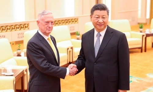 Bộ trưởng Quốc phòng Mỹ Jim Mattis (trái) và Chủ tịch Trung Quốc Tập Cận Bình tại Bắc Kinh ngày 27/6. Ảnh: China News Service.