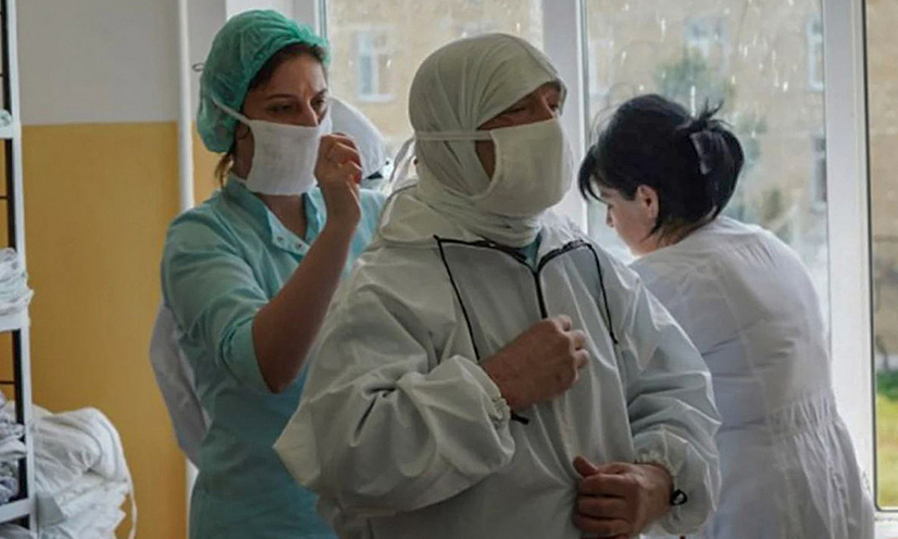 “Về cơ bản, việc điều trị của hai nhóm bệnh nhân là như nhau”, ông nói. “Nhưng vì chúng tôi không có kết quả xác minh trong phòng thí nghiệm, chúng tôi có thể tổng hợp số liệu thống kê theo cách này.” – Bác sĩ của Bệnh viện Dagestan. Ảnh: Bộ Y tế Dagestan – Giống như nhiều quốc gia khác, nhân viên y tế tuyến đầu của Dagestan dễ bị tổn thương nhất trước tác động của đại dịch. Kể từ khi dịch bệnh xảy ra, khoảng 40 đến 50 nhân viên y tế của Dagestan đã chết. Dagestan có khoảng 3 triệu cư dân và 635 đơn vị chăm sóc đặc biệt với mặt nạ phòng độc.
