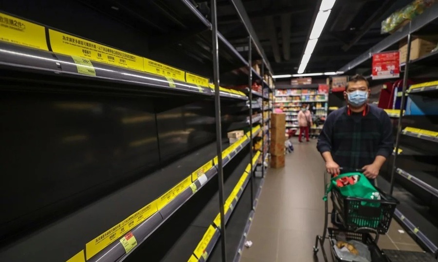 Vào ngày 7 tháng 2, người đàn ông đeo mặt nạ đẩy chiếc xe đẩy giữa các kệ trống. Người mua làm sạch các kệ đựng gạo, thịt, rau và các sản phẩm vệ sinh trong siêu thị, như nước rửa tay, nước khử trùng và giấy vệ sinh. Ảnh: Reuters.