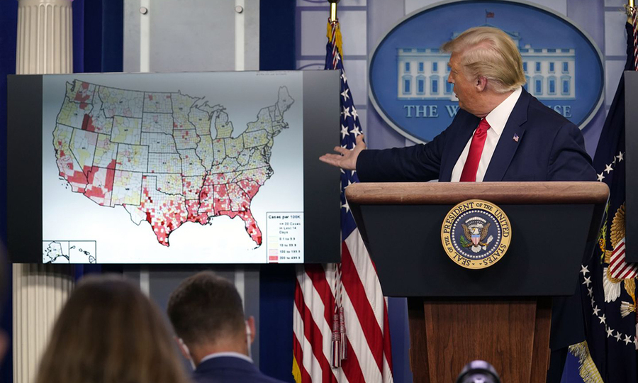 Tổng thống Donald Trump tại cuộc họp báo Covid-19 tại chi nhánh La Maison vào ngày 23/7. Một tháng trước, Tổng thống Donald Trump vẫn khăng khăng rằng Covid-19 “biến mất” tại Hoa Kỳ, nhưng giờ đây ông thừa nhận rằng nó “khủng khiếp và nguy hiểm”. “Vào ngày 21 tháng 7, Trump đã cam kết thực hiện một” chiến lược mạnh mẽ “để kiểm soát nCoV và đảm bảo việc cung cấp nhanh chóng lô vắc-xin đầu tiên được sản xuất.