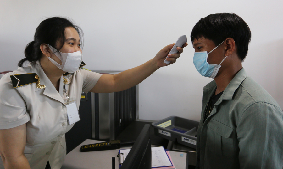 Nhân viên an ninh sân bay Chu Lai Quảng Nam đã đo nhiệt độ cơ thể của hành khách lên máy bay vào sáng 28/7. Ảnh: Đắc Thanh .