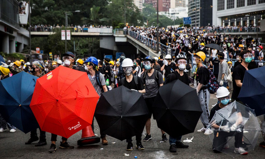 Trong cuộc đụng độ với cảnh sát Hồng Kông vào ngày 12 tháng 6, những người biểu tình đeo mặt nạ và ô để chống lại hơi cay. Ảnh: Agence France-Presse.
