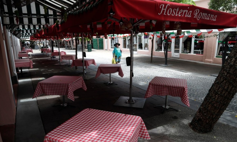 Ngày 12 tháng 7, Một phụ nữ đi qua đồ đạc trống rỗng trong một nhà hàng ở bãi biển Miami, Florida Ảnh: AP