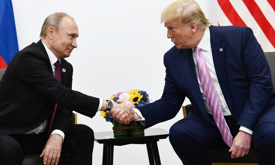 Tổng thống Mỹ Trump (phải) và Tổng thống Nga Putin tại cuộc họp G20 tại Nhật Bản vào ngày 28 tháng Sáu. Ảnh: AFP. — Khi ngồi xuống và nói chuyện, hai cái đầu là hai chân. Thay vì dựa lưng vào ghế, Putin nghiêng người về phía trước với hai tay giữa hai chân.
