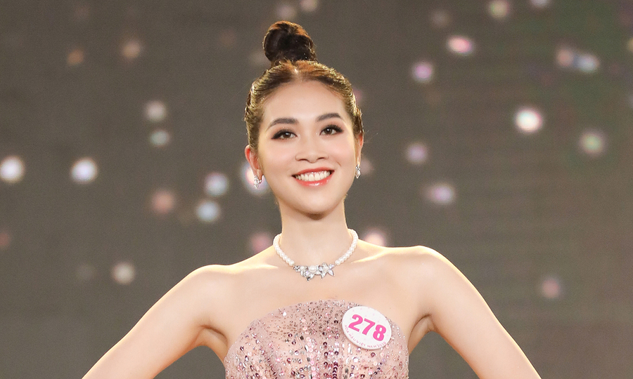 Vũ Quỳnh Trang gây ấn tượng với chiếc váy lệch vai màu trắng hồng vì cô cao 1,69 m và chiều cao 83-62-91 cm, đến từ Nam Định, hiện đang phụ trách trẻ em Việt Nam trong một công ty trại hè thiếu nhi quốc tế. Cô là Đại học Huế Châu Á năm 2020.