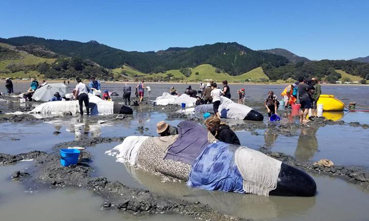 Cuối tuần trước, hàng chục con cá voi phi công đã bị cuốn trôi ngoài khơi bờ biển New Zealand. Ảnh: Jonah Project.