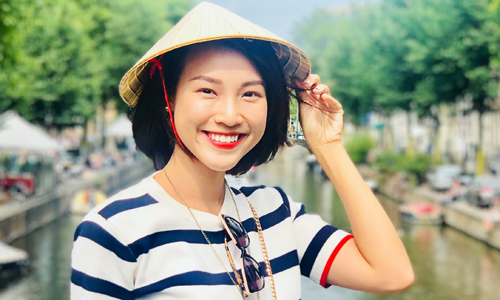 Điểm đến đầu tiên của Hoàng Thiện là thủ đô Amsterdam của Hà Lan. Cô treo trên đường phố với kiến trúc cổ điển và hiện đại. Người đẹp luôn đội mũ rơm khi chụp ảnh kỷ niệm.