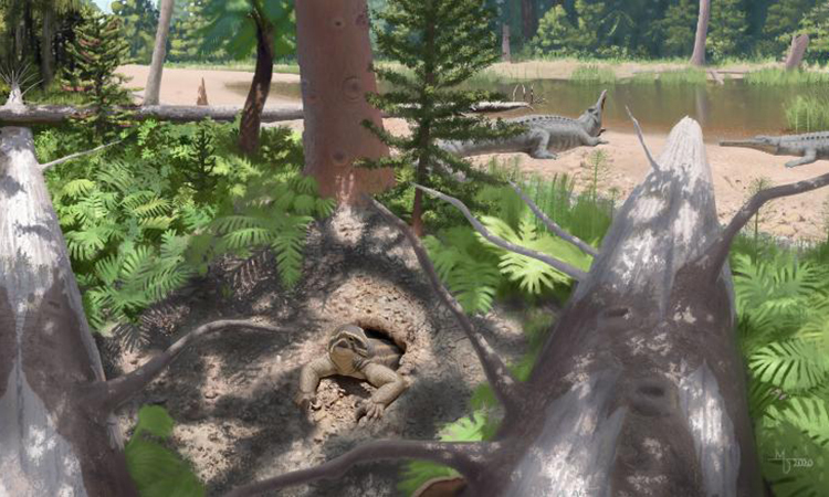 Tại điểm nóng trên sườn núi giông đã hóa thạch ở Vườn Quốc gia Rừng Hóa Đá ở Tây Nam Hoa Kỳ, người ta đã phát hiện ra di tích của sinh vật Tam Điệp có tên khoa học là “Skybalonyx bal” (Skybalonyx skapter). Một nghiên cứu được công bố vào tháng này trên tạp chí Vertebrate Paleontology cho biết rằng những con trượt ván Skybalonyx có ngoại hình lai giữa thú ăn kiến và tắc kè hoa. Nó là một thành viên mới của loài bò sát Tyrannosaurus rex trước đây được cho là chỉ sống trên cây.