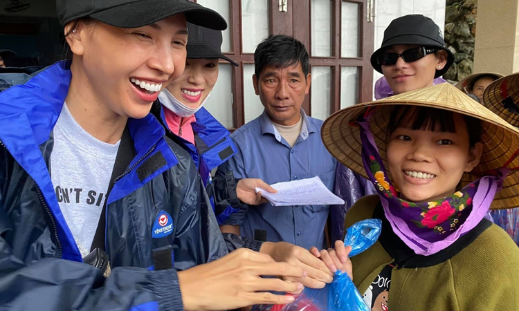 Hoa hậu Kỳ Duyên (phải) và Minh Triệu trao quà cứu trợ cho thị xã Ba Đồn, huyện Trạch, Quảng Bình. Do nước lũ dâng cao đột ngột làm hỏng hàng cứu trợ trong nhà kho nên cả hai đều khẩn trương tìm mua thêm lương thực. Kỳ Duyên cho biết: “Thời tiết rất tốt, trời mưa phùn, trời se lạnh, cả đoàn tự tin phát 1.500 phần quà, tôi đã nghiên cứu rất kỹ về số lượng và khẩu phần ăn để mọi người có thể ăn trong một tuần nước rút”.