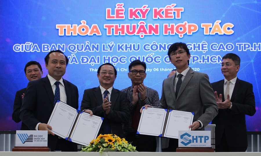 Đại học Quốc gia TP.HCM có hơn 3.500 giáo sư, trong đó có gần 2.000 tiến sĩ, hơn 80 phòng thí nghiệm và nhiều nhóm nghiên cứu hùng hậu, sẽ phối hợp thực hiện các dự án khoa học công. Công nghệ, chuyển giao và tiếp thị các công ty trong khu công nghệ cao. Cả hai bên sẽ thành lập một nhóm nghiên cứu mạnh và phòng thí nghiệm trọng điểm của công ty. Ông Thi, Trưởng ban quản lý khu công nghệ cao, ký kết hợp tác vào chiều 6/11. Ảnh: Nguyễn Nam.
