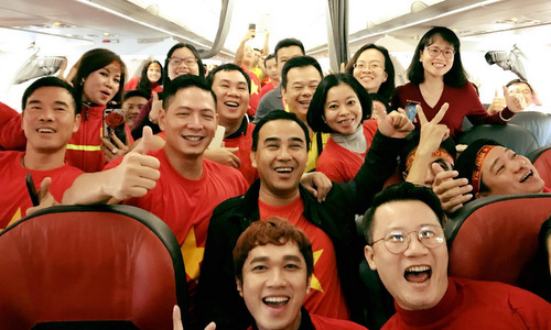 Cặp đôi Hoàng Bách, Bình Minh, Quyền Linh và những người bạn đã bay sang Thường Châu, Trung Quốc lúc 4h sáng 27/1 để cổ vũ cho đội. Hoàng Bách cho biết máy bay chật cứng người, hầu hết mặc đồ đỏ để chuẩn bị cho trò cổ vũ khi đến.