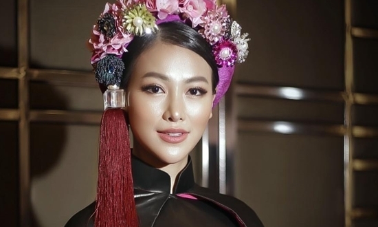 Phương Khánh mặc áo dài. Đây là chất liệu do nhà thiết kế Võ Việt Chung sản xuất. Trang phục được cách điệu với áo choàng và hoa văn thêu tay.