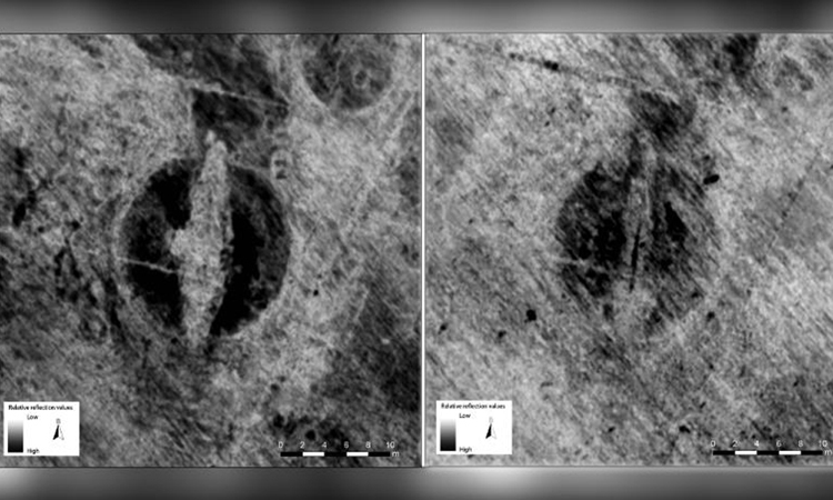Con tàu cướp biển xuyên qua mặt đất trong ảnh radar ở độ sâu 0,3-0,5 m (trái) và 0,9-1,1 m (phải). Ảnh: Antiquity Publications Ltd / L. Gustavsen .