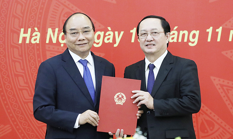 Thủ tướng Chính phủ Nguyễn Xuân Phúc trao quyết định của Chủ tịch nước về việc bổ nhiệm chức vụ cho ông Huỳnh Thành Đạt. Ảnh: Ngọc Thanh .