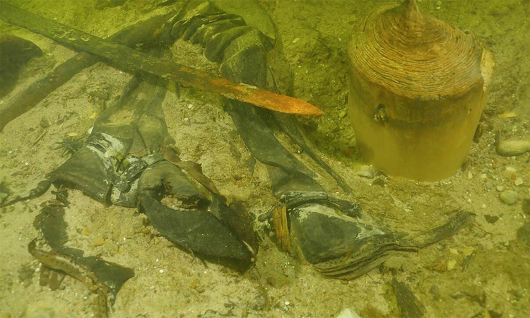 Xác của một người lính thời trung cổ và một số đồ vật chìm xuống đáy hồ. Ảnh: A. Matiukas .