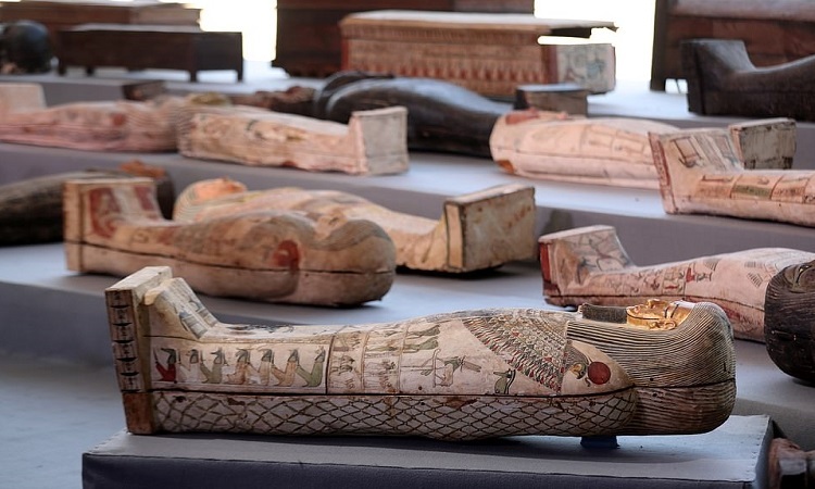 Các quan tài được đặt trong 3 sảnh nấm. Ảnh: Reuters – Những chiếc quan tài bọc kín màu và những bức tượng nhỏ chôn cách đây 2500 năm được trưng bày trong một cuộc triển lãm dưới chân kim tự tháp bậc thang nổi tiếng Djoser ở Saqqara. Chiếc quan tài bằng gỗ mới được phát hiện thuộc về những người có địa vị cao hơn trong xã hội, chẳng hạn như quan tài và các thầy tu. Các nhà khảo cổ đã phát hiện ra chiếc quan tài này trong số 3 chiếc quan tài được chôn cất ở độ sâu 12m ở nghĩa trang Saqqara.
