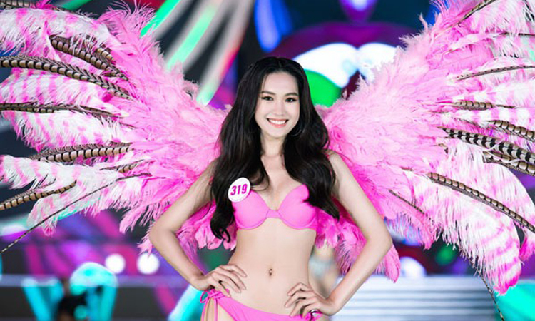 Thi Tường Vy cao 1,76m, cao 86-64-93cm. Cô ấy đang mặc một bộ bikini nhiệt đới và lông công.