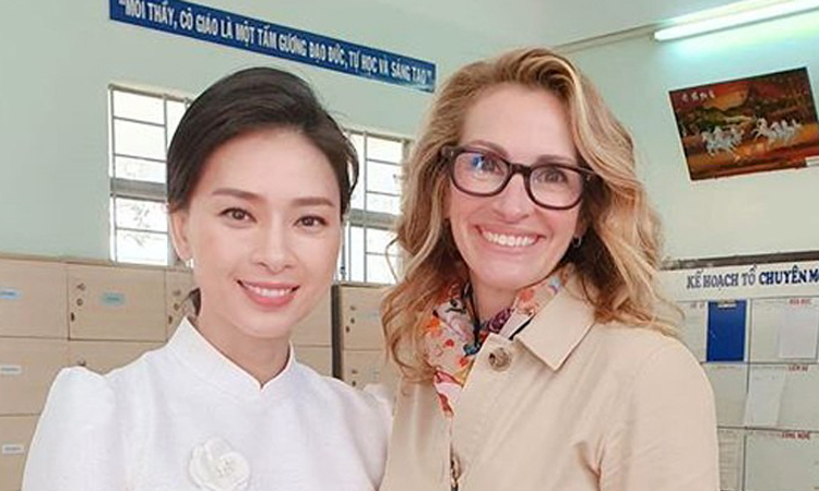 Ngô Thanh Vân (trái) và Julia Roberts. Nhiếp ảnh: Văn Ngô. Julia Roberts (Julia Roberts) năm nay 52 tuổi, với “Người phụ nữ xinh đẹp”, Erin Brokovich, “Đám cưới của người bạn thân nhất của tôi”, “Ngày lễ tình nhân”, “Nụ cười của nàng Mona Lisa”, v.v. Nổi tiếng với phim ảnh. Nó tượng trưng cho vẻ đẹp của thế giới. . Nữ diễn viên ủng hộ kế hoạch của Quỹ Obama để giúp đỡ các cô gái.