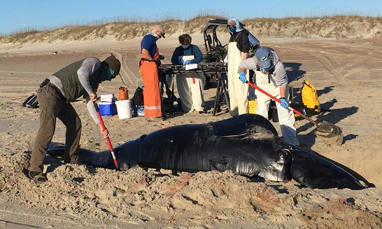 Các nhà khoa học đã lấy mẫu và xử lý xác cá voi ngoài khơi bờ biển Cape Lookout. Ảnh: NOAA .—— Theo Cục Thống kê Đại dương Quốc gia, mùa sinh sản của cá voi sát thủ Bắc Đại Tây Dương trong nửa đầu năm nay bắt đầu thảm khốc, khi nó ở Bờ biển Quốc gia Cape Outlookout ở Cape North Carolina vào thứ Sáu tuần trước. Trẻ vị thành niên đầu tiên chết đuối trên hòn đảo biệt lập đã bị chết đuối. Và Cơ quan Khí quyển Hoa Kỳ (NOAA).