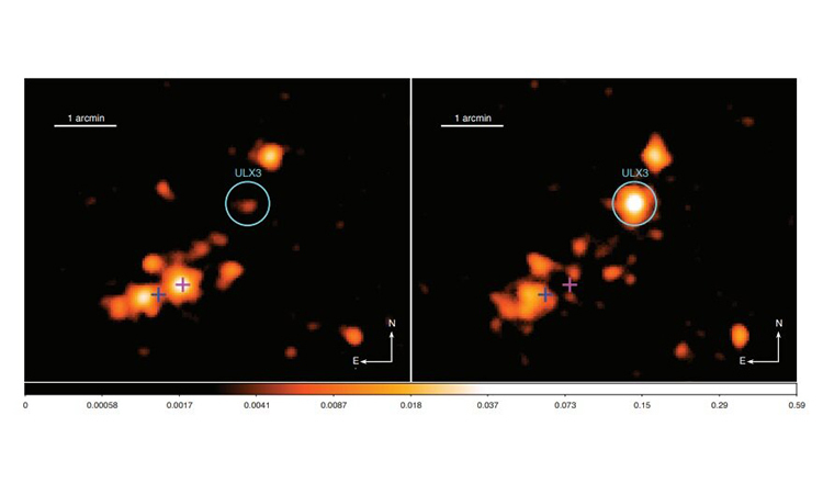 Thông thường chỉ có một ULX trên mỗi thiên hà, nhưng một số trường hợp đặc biệt (chẳng hạn như NGC 7090) có thể chứa nhiều hơn thế này. Thiên hà xoắn ốc, cách chúng ta 31 triệu năm ánh sáng này, trước đây đã từng biết đến hai nguồn tia X siêu sáng, NGC 7090 ULX1 và NGC 7090 ULX2. Các nhà nghiên cứu từ Đại học Cambridge ở Vương quốc Anh do Dominic Walton thuộc Cơ quan Hàng không và Vũ trụ Quốc gia (NASA) dẫn đầu đã báo cáo rằng một ULX khác đã được tìm thấy trong NGC 7090 với độ sáng cực đại là 6 x 10 ^ 39 erg / s (erg là một phép đo duy nhất về năng lượng và công cơ học). -Ảnh cho thấy sự thay đổi độ sáng của NGC 7090 ULX3. Ảnh: NASA.