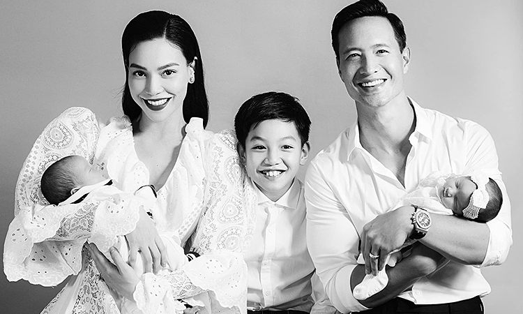 Cô diện váy trắng cổ điển của NTK Lý Quí Khánh, tạo dáng cùng Kim Lý, Subeo và cặp song sinh Leon-Lisa. Nam ca sĩ rất vui vì nhận được nhiều lời chúc mừng mới từ bạn bè, đồng nghiệp. Cô tiếc vì bố mẹ Kim Lý ở Thụy Điển vẫn chưa được gặp hai cháu và chỉ có thể gọi điện cho cô mỗi ngày. Nhiếp ảnh: Tang Tang.