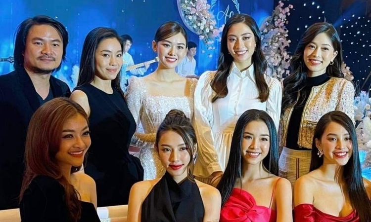 Từ trái qua phải, hàng đầu tiên: Đạo diễn Hoàng Nhật Nam và vợ Tường San, Lương Thùy Linh, Phương Nga. Hàng dưới, từ trái qua: Kiều Loan, Thủy Tiên, Thúy An, Tiểu Vy, Mỹ Linh. Ảnh: S.V.