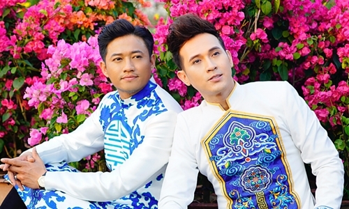 MC Anh Quan mặc áo dài sửa đổi với chủ đề năm mới của nhà thiết kế Brian Vo. Ca sĩ Nguyễn Vũ (phải) và người mẫu Nam Phong cũng đến thăm quận 8 để dành thời gian bận rộn nhất trong năm.