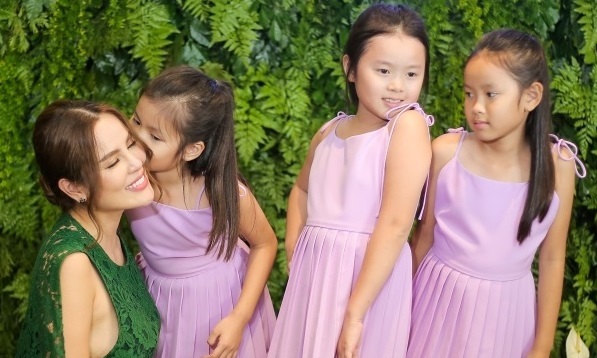 Hoa hậu Hòa bình Thế giới Phương Lê diện đầm ren xanh đi dự tiệc do gia đình tổ chức. Vừa tiếp khách, cô vừa chăm sóc ba cô con gái.