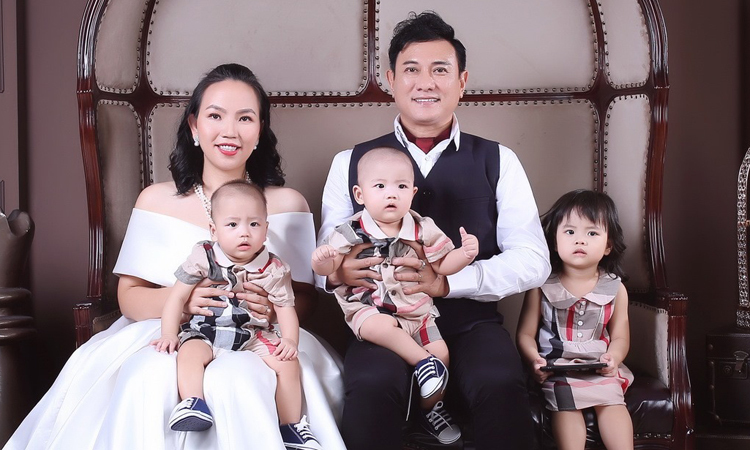 Nam diễn viên Hoàng Phúc và vợ Uyên Phương chụp ảnh kỷ niệm cùng con gái đầu lòng Happy (hơn hai tuổi) và cặp song sinh (một tuổi).