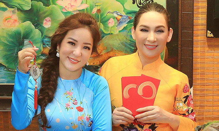 Ruan Nv Cat), con gái nuôi – Ngân Hà (trái) -Thúy Nga (Thúy Nga) và con nuôi ca sĩ Phi Nhung – ca sĩ He Wen Cu (thứ hai từ phải sang) mặc áo dài Đại theo mẹ dạo phố. Con gái Nguyệt Cát (thứ ba từ trái sang), con gái nuôi Ngân Hà (trái) -Thúy Nga và con nuôi ca sĩ Phi Nhung – ca sĩ Hồ Văn Cường (thứ hai từ phải sang) mặc áo dài. Mẹ dắt ra đường.