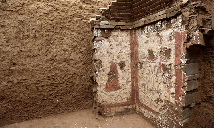 Bức tranh tường cảnh âm nhạc trong một ngôi mộ cổ ở Thiểm Tây. Ảnh: Tân Hoa Xã-Theo báo cáo từ Viện Khảo cổ tỉnh Thiểm Tây cuối tuần trước, hai ngôi mộ lớn từ thời nhà Đường (618-907) đã được phát hiện ở làng Puli, cách quận lỵ khoảng 40 km. Tây An, thủ đô. Chúng nằm theo hướng bắc nam và có chiều dài lần lượt là 42,5 và 33,5 m. Trong ngôi mộ nhỏ hơn này được trang trí bằng hàng loạt bức tranh tường miêu tả nhiều cảnh sinh động khác nhau như ca múa nhạc hay cưỡi ngựa và huấn luyện lạc đà.