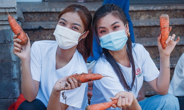 Á quân Phương Anh, Diễm Trang, Kiều Loan, Thúy An và Hoa khôi Cần Thơ Thúy Vi mặc áo phông trắng, quần jean và đeo khẩu trang đi làm. Họ chia nhau nhiệm vụ, người đóng gói, người dẫn mọi người ra bãi xe mua rau. Ăn bốn tấn cà rốt và một tấn bắp cải tiệt trùng vào buổi sáng. Người đẹp khoe chân lấm tay bùn cho thấy họ rất vui khi hoàn thành được công việc ý nghĩa.