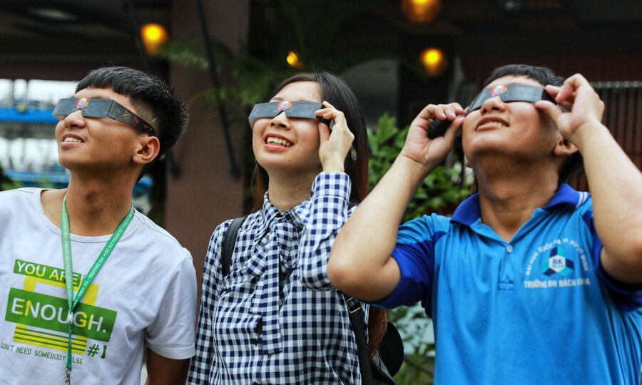 Tại Hà Nội, Đại học Khoa học và Công nghệ Hà Nội (USTH, Đại học Pháp Việt Nam) đã hợp tác với cộng đồng vật lý thiên văn Hà Nội để tổ chức Lễ hội Không gian 2020 để quan sát nhật thực qua kính viễn vọng và bộ lọc. Cây cầu có 600 người tham gia, bao gồm học sinh từ các trường trung học trong khu vực, học sinh, phụ huynh và câu lạc bộ vật lý thiên văn. Hà Nội. Ở đây, thời gian dễ quan sát. Nhật thực một phần bắt đầu lúc 1:16 chiều và đạt điểm cao nhất lúc 2:55 chiều. Tỷ lệ bao phủ cao tới 71%. Lúc 2:55, mặt trời trở nên tối hơn ở mức 71%. Ảnh: Tuấn Dương.