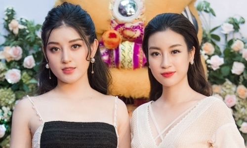 Huyền Mỹ (trái), Phó chủ tịch Việt Nam năm 2014. Cô ấy mặc một chiếc váy voan có họa tiết hoa nổi.