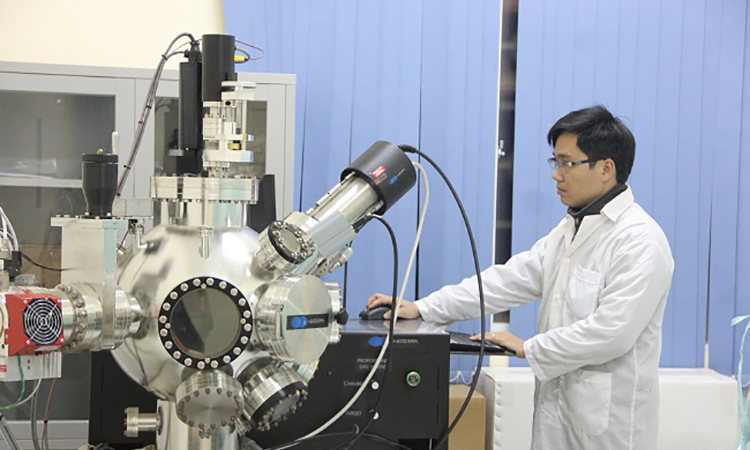 Nhân viên của Khoa Vật lý, Đại học Khoa học Tự nhiên, nghiên cứu về máy điện tử màng mỏng xung (Pulse Electrodepocation, Model P120, Neraf, USA). Ảnh: HH .
