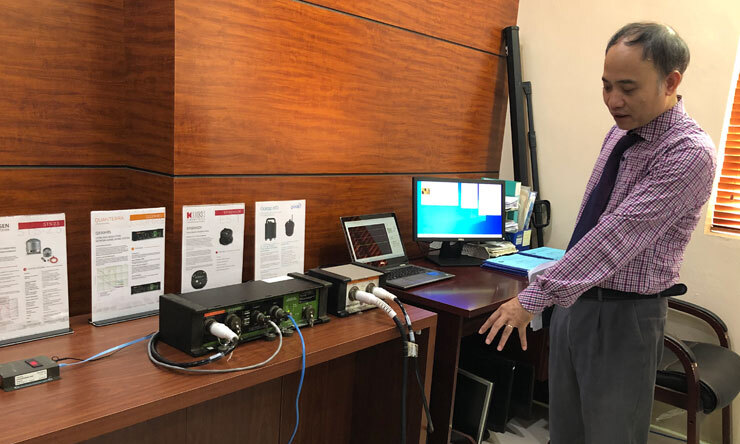 Ông Ruan Xuan’an giới thiệu thiết bị đo dư chấn Ảnh: HM